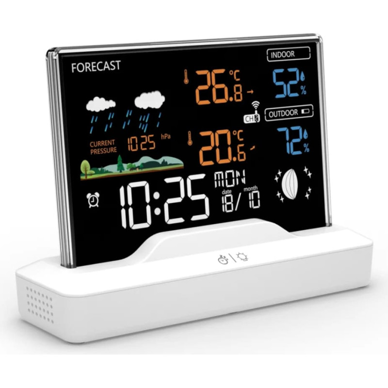 Питание: сеть 5В или аккумулятор. Функции: Барометр Будильник Память максимальных и минимальных измерений Измерение внутренней температуры Измерение наружной температуры Измерение влажности Прогноз погоды Часы Связь: радиосинхронизация времени (DCF) Количество поддерживаемых датчиков: 3 Количество датчиков в комплекте: 1 Диапазон датчика: 80 Материал: пластик В комплекте оборудование: Наружный датчик Руководство Гарантийный талон Адаптер питания