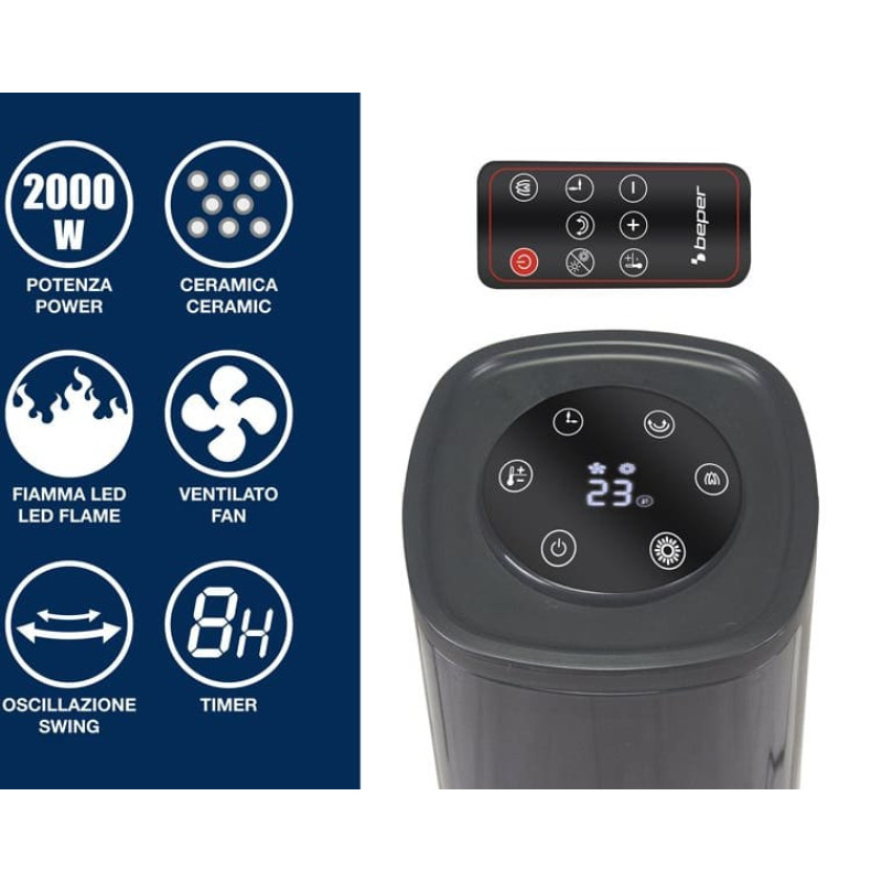 Элегантный башенный тепловентилятор с керамическими нагревательными элементами, обладающий мощным нагревательным эффектом и низким энергопотреблением. Оснащен сенсорной панелью управления с дистанционным управлением и программируемым таймером до 8 часов. Светодиодная подсветка с эффектом пламени для создания теплой и уютной атмосферы в каждой комнате. Регулируемый термостат и функция вентиляции, автоматическое горизонтальное колебание и светодиодный дисплей.