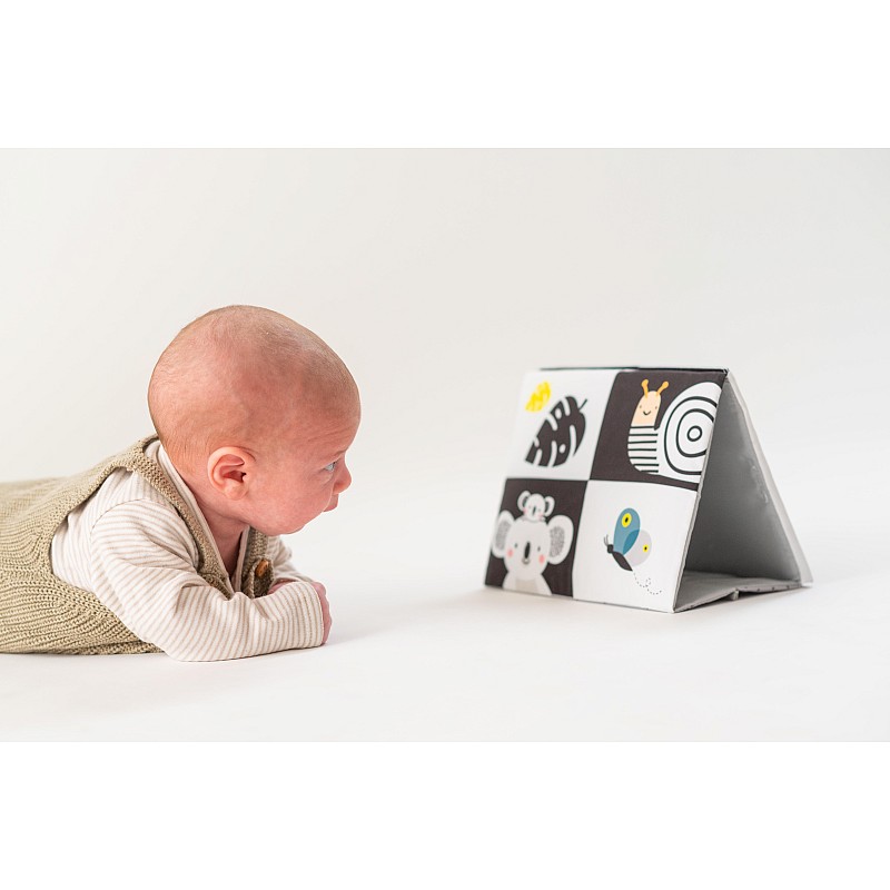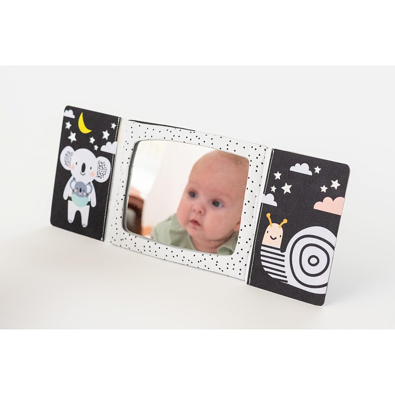 Первая книжка-зеркало для малыша, которую можно положить на животик, с огромным, безопасным для ребенка зеркалом, контрастными и красочными иллюстрациями, которые стимулируют чувства и эмоциональный интеллект ребенка. Зеркало XL помогает ребенку научиться самосознанию, визуальному наблюдению и развить коммуникативные навыки. Зеркало покрыто книжными клапанами, которые можно использовать для игры в прятки между родителями и ребенком. Отверстия в форме звезды в клапанах, закрывающих зеркало, сверкают и привлекают внимание малыша. Вертикальное положение книги помогает ребенку проводить время на животе.   Информация о продукте: Игрушка подходит для использования на животике или в сидячем положении, поощряет игровое взаимодействие и активность родителей и детей.4 способа игры:1. 0м+ - обратная сторона: иллюстрации, насыщенные контрастами 2. 0м+ сторона зеркала: игра с зеркалом, самопознание и знакомство 3. 3 м+ закрытая книга: цветная сторона 4. 0 м+ пряток: закрывайте, открывайте, удивляйте и повторяйте для бесконечного веселья и веселого общения. Легкий и легко складывается, удобно использовать в дороге.Размер: 18,5 х 13,5 смПодходит для детей от 0+ месяцев Ценности развития: Двусторонняя, вертикальная зеркальная книга размера XL с 2 этапами развития:Сторона 1: контрастные цвета, простая визуальная стимуляция. Помогает развивать чувства и эмоциональный интеллект ребенка.Сторона 2: насыщенные цвета и огромное безопасное для ребенка зеркало, помогающее малышу научиться самосознанию, визуальному наблюдению и развитию коммуникативных навыков.