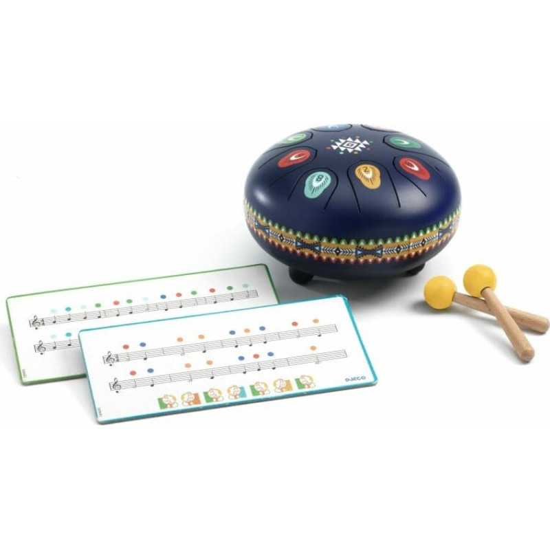 Сказочный стальной барабан с красивыми иллюстрациями на тему коренных американцев. У этого музыкального ударного инструмента 8 язычков, соответствующих 8 различным музыкальным нотам. Играть на нем так просто и интуитивно понятно: ударяйте по язычкам барабанными палочками и слушайте нежный, расслабляющий звук, исходящий от инструмента. Идеально подходит для создания или разучивания успокаивающих мелодий! Идеальный подарок для маленьких музыкантов в возрасте от 5 лет. Состав: 1 стальной барабан (диаметр: 16 см) с 8 язычками, 2 маленькие деревянные барабанные палочки (длина: 8,5 см) с резиновым наконечником диаметром 2 см и 2 двусторонние карточки с нотными партитурами (18 x 8,5 x 0,2 см). Интуитивно понятный, простой в игре инструмент с мягким, расслабляющим и приятным звучанием. В комплект входят четыре музыкальные пьесы с цветными значками и цифрами, соответствующими 8 нотам на барабане. Резиновый колпачок над отверстием в нижней части барабана можно использовать для более тихого звуча
