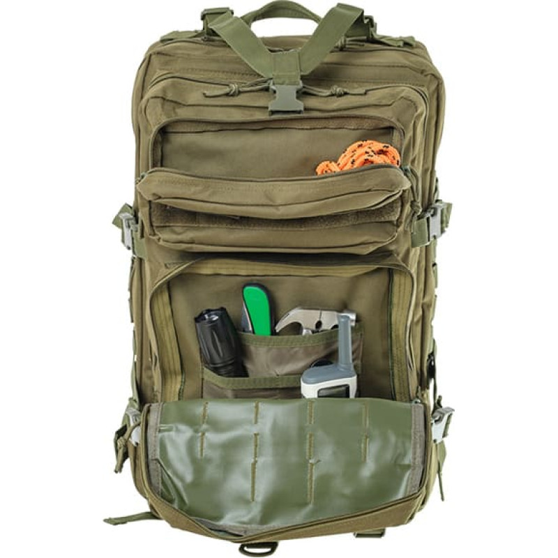 Водонепроницаемый полиэстер 1000D Вместимость: 40 л Размер: 50 x 25 x 28 см 2 больших основных отделения Вентилируемые плечевые ремни и спинка Компрессионные ремни Система крепления Molle Регулируемые поясные и нагрудные ремни Отделение для ноутбука 15,6" D-образные кольца Регулируемые плечевые ремни Карман для питьевой системы Панель на липучке для нашивок и эмблем