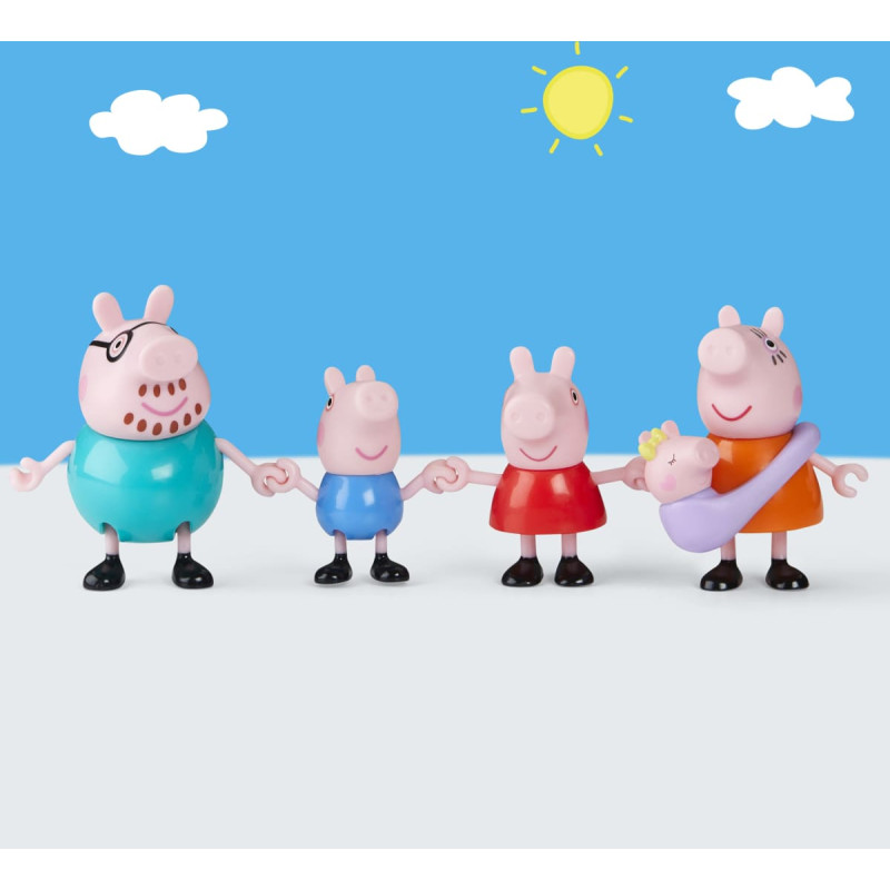 Семья Свинок теперь стала семьёй из пяти! Этот игровой набор Peppa Pig включает фигурки Папы Свина, Мамы Свинки, Джорджа, Пеппы и малышки Эви в переноске. Маленькие дети могут надевать переноску на Мамину или Папину фигурку и воссоздавать любимые сцены из мультфильма или придумывать собственные истории. Позируемые фигурки даже могут держаться за руки, создавая милые семейные моменты. Игрушки из набора «Семья из пяти Peppa Pig» — отличный подарок для девочек и мальчиков от 3 лет и старше. Высота фигурок: 7,5 см.
