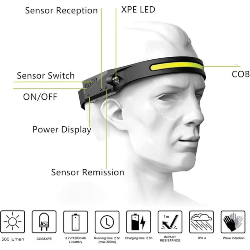 Широкий фонарь COB спереди (300 лм) + светодиод XPE сбоку. Кнопка волнового датчика для включения/выключения головного прожектора движением руки. Пять уровней: COB 100%, COB 50%, XPE 100%, XPE 50% и стробоскоп. Расстояние луча: около 100 метров IPX4 защита от брызг Встроенный аккумулятор емкостью 1200 мАч с временем автономной работы 2,5-6 часов (в зависимости от режима освещения) USB-C для зарядки