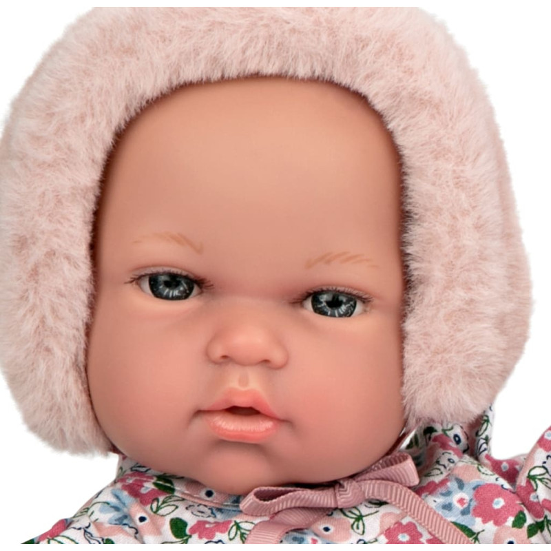 • The doll is dressed in pink floral clothes and a fluffy pink hat.