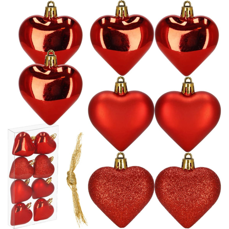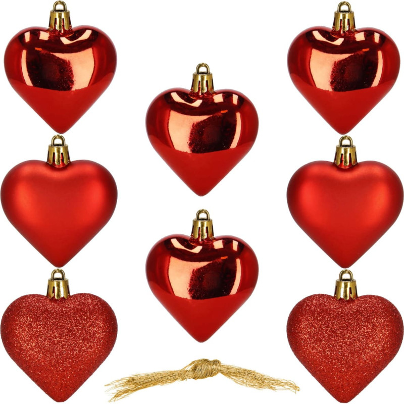 Основные данные Марка: Springos® Материал: пластик Цвет: красный Количество штук в наборе: 8 Невыбиваемые ёлочные шары Тип: блестящие / с блёстками / матовые Форма: сердце В набор входят: 4 блестящих шара 2 шара с блёстками 2 матовых шара Размеры: Общая длина: 7 см Длина без подвески: 5,5 см Ширина в самом широком месте: 6 см