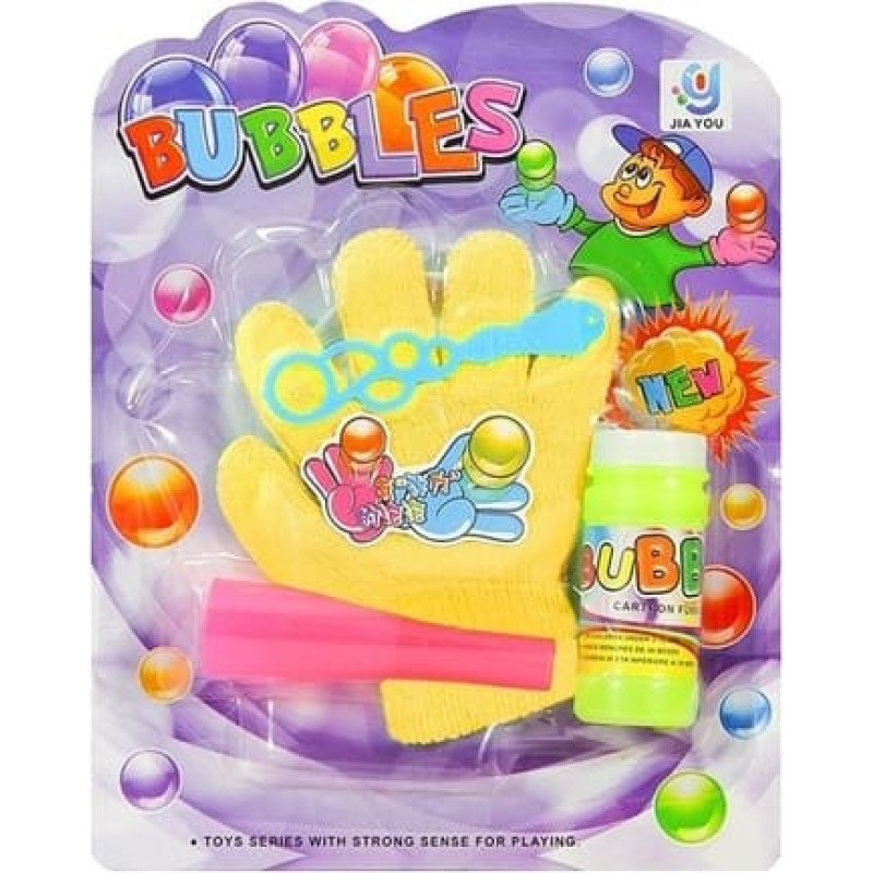 Komplektā ietilpst: - šķidruma trauks - caurulīte - pūtējs - burbuļu šķidrums - viens cimds: universāls izmērs.