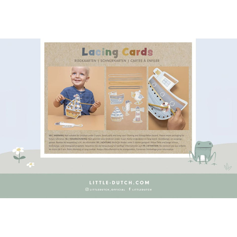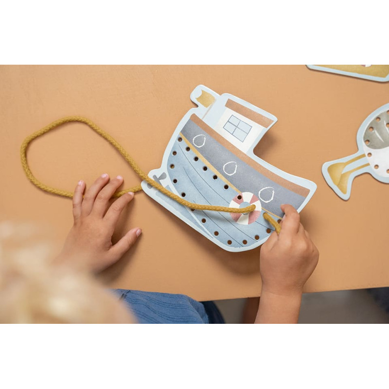 Давайте шнуровать! Следуй по рисункам из коллекции Sailors Bay и продень шнурочек через маленькие отверстия. Добавь детали к парусу яхты, палубе рыбацкой лодки, маяку, пеликану и чайке Джеку! Отличная игра для развития мелкой моторики, координации и концентрации у малышей. В набор входит 5 прочных картонных карточек с иллюстрациями Sailors Bay и один шнурок с пластиковыми наконечниками для удобства. Размер: 22 × 17,5 × 3,5 см Материал: прочный картон Возраст: от 3 лет Не подходит детям младше 3 лет – содержит мелкие детали.