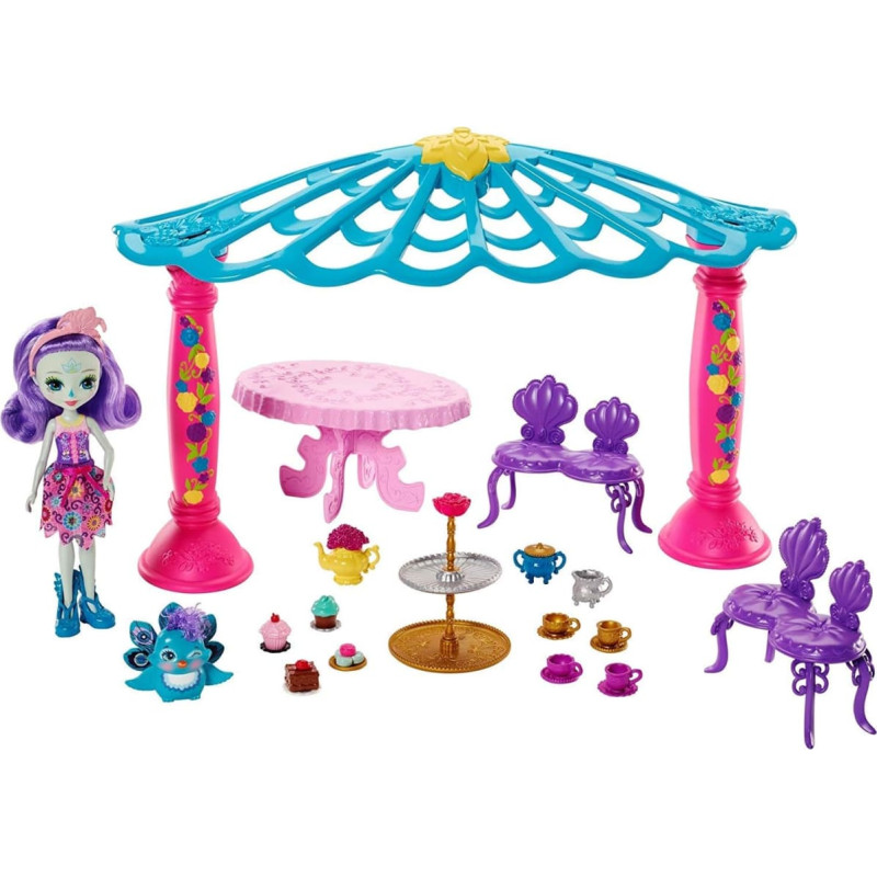 В набор входит кукла Enchantimals Паттер Пикок (15 см), её питомец Флап, беседка, стол, две скамейки и маленькие аксессуары — чайник, чашки и сладости для воссоздания классической сцены чаепития. На круглом розовом столике расположены милые чайные аксессуары: чайник, чашки с блюдцами и двухъярусная подставка для десертов. Капкейки, макаруны и торт выглядят так аппетитно, что хочется попробовать! Паттер одета в красивый наряд — стильную розовую юбку с цветочным принтом, фиолетовый топ и эффектные бирюзовые туфли. Её длинные кудрявые фиолетовые волосы украшены розовым аксессуаром.