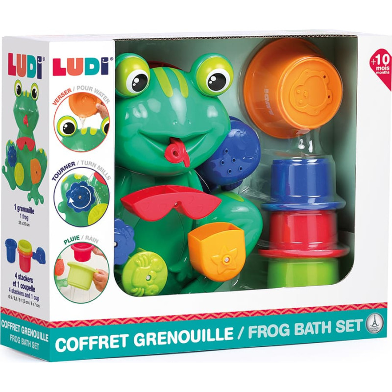 The toy attaches to the wall or the side of the tub using suction cups. Size of the frog 25x20x9 cm. Packaging measurements 33x27x10 cm. Recommended for ages 10 months and up. Product bears the CE marking. Rinse with clean water and dry the toy after use. Made in China, Created by SAS JBM, Ludi, France.