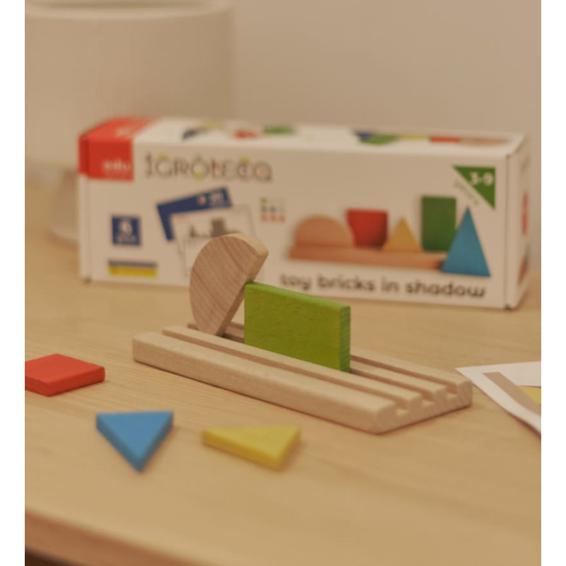 The set includes 5 multi-colored geometric shapes and a board with three longitudinal grooves. The child's task is to put the elements in the grooves of the base in such a way that the image corresponds to the task in the instruction book. Helps develop fine motor skills, logical thinking, sensory skills, memory and colour recognition. Suitable for independent use, as well as for working with a group of children, in the family circle, etc. There are three types of tasks: - The easiest - to start the game, when 3-4 elements are used to build the appropriate structure.